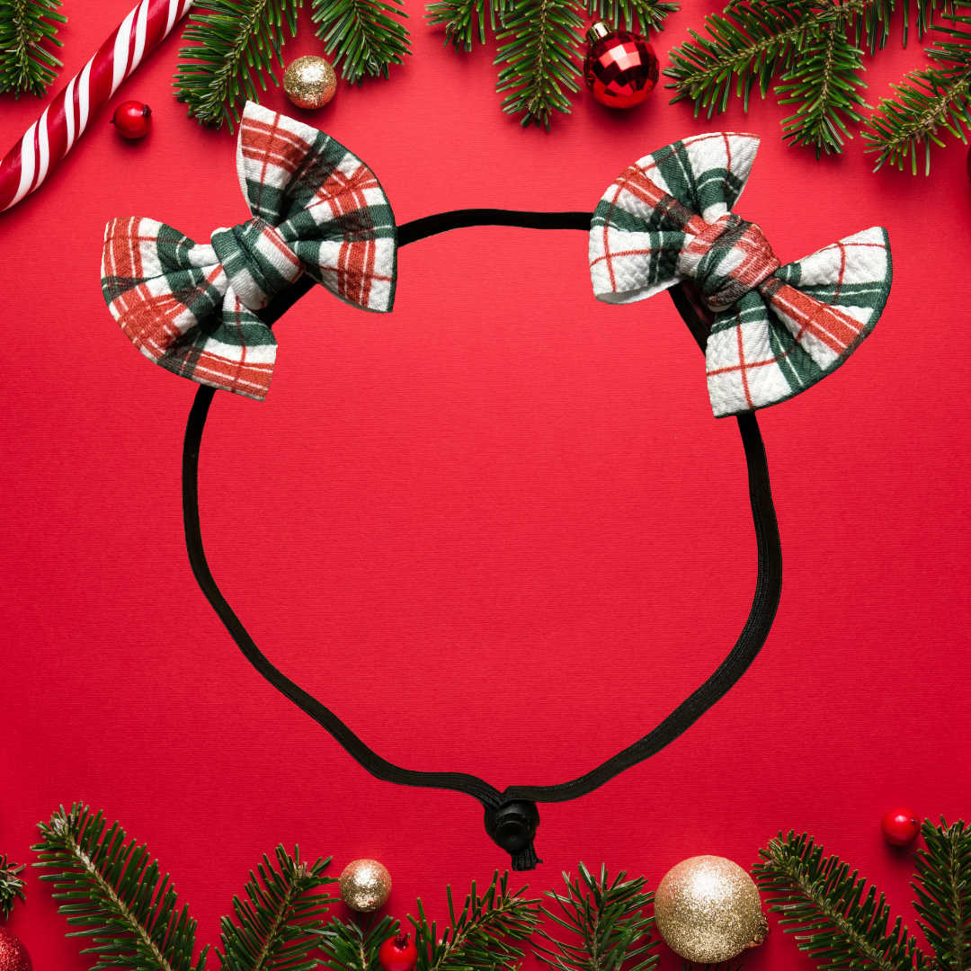 Bows measure approximately 3" each and can be slid along the elastic loop to adjust to varying widths between ears.