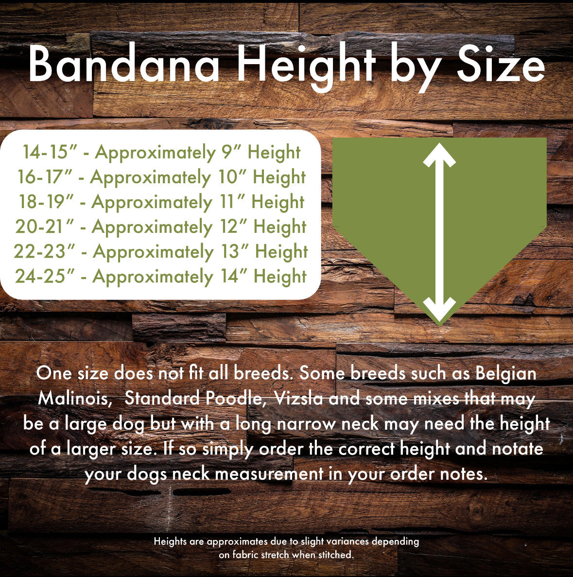 Measure your dogs neck where you would like the bandana to rest and order the coordinating neck size. Take into to account for thick coat or loose skinned breeds you may want to go up a size if they fall in between size options.